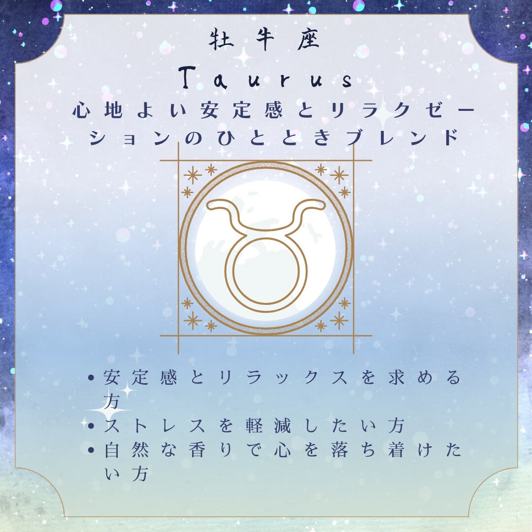 説明: 穏やかで安定した香りが特徴です。ラベンダーのリラックス効果が心の安定をもたらし、サンダルウッドの深いウッディな香りが地に足の着いた感覚を促進します。イランイランの甘く官能的な香りが、牡牛座の美的センスと感覚的な喜びを引き立てます。このブレンドは、ストレスを軽減し、快適さと安らぎを提供します。