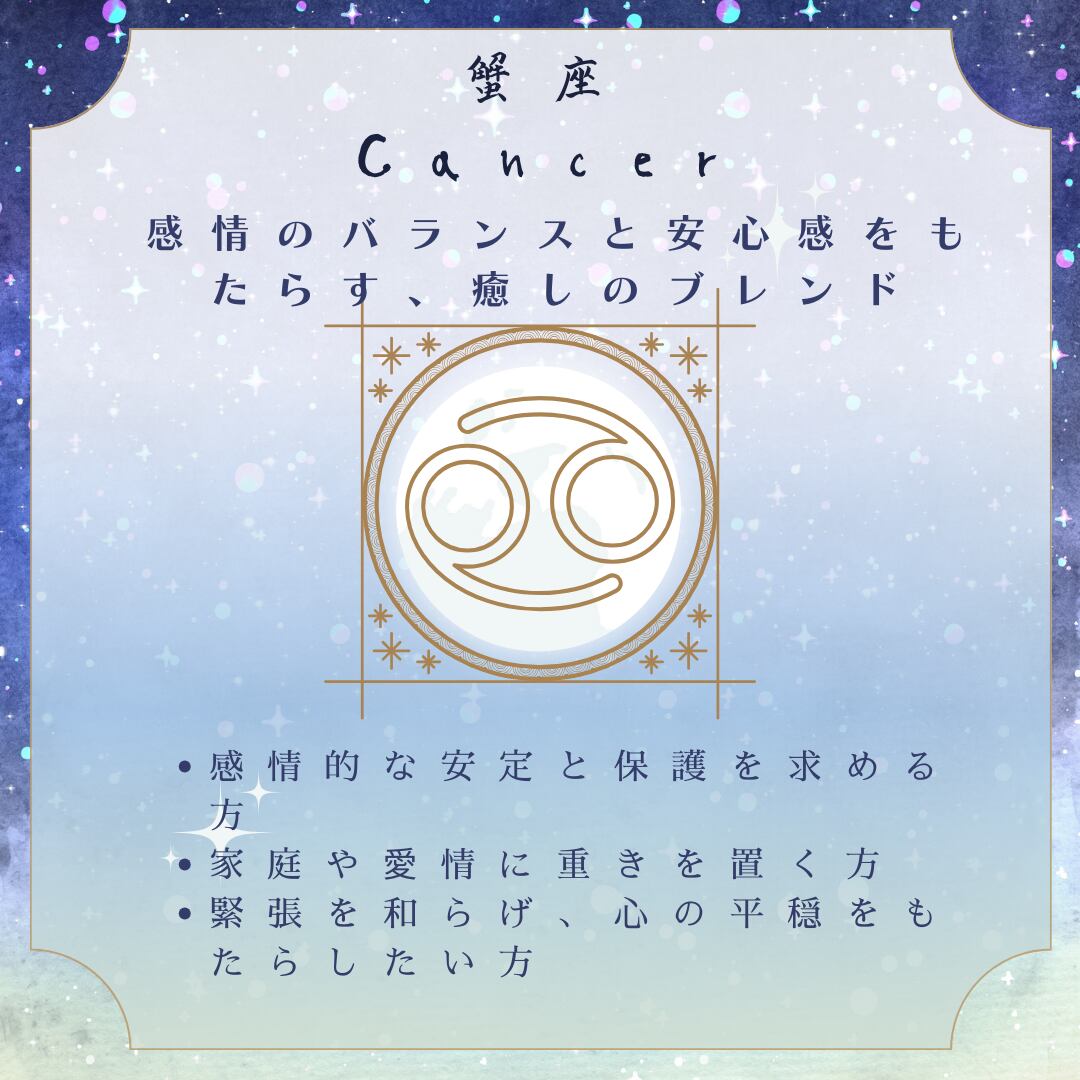 説明: 蟹座は感情豊かで家庭や身近な人々を大切にする星座です。ゼラニウムは感情のバランスを整え、内面的な落ち着きをサポートします。オレンジの明るくフレッシュな香りが気分を高め、ポジティブなエネルギーをもたらします。サンダルウッドは深いリラクゼーションを提供し、心を落ち着ける効果があります。このブレンドは、蟹座の優しさや思いやり、家庭愛を強化し、心の平穏と安定を促します。