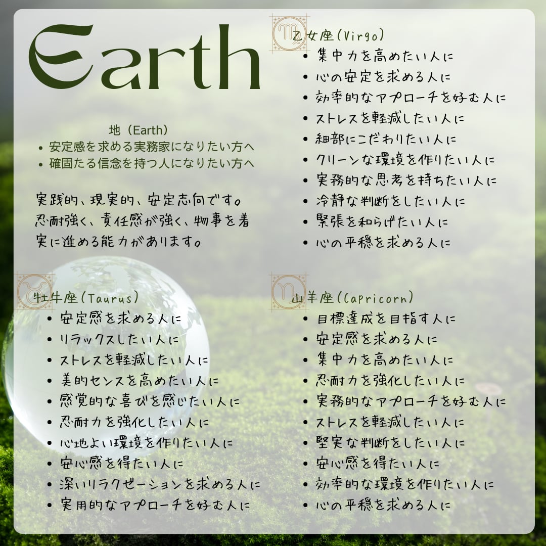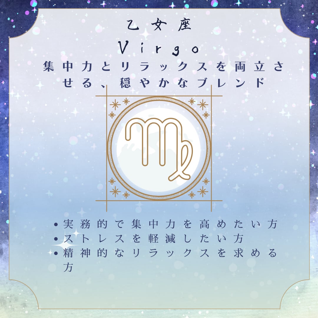 説明: クリーンで清潔感のある香りが特徴です。ローズマリーのハーバルな香りが集中力と明晰さを高め、ラベンダーのリラックス効果が心の安定を促進します。ペパーミントの爽やかな香りが頭をスッキリさせ、実務的なアプローチをサポートします。このブレンドは、冷静で効率的な乙女座に最適です。