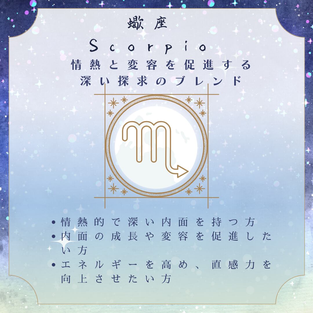 説明: 神秘的で深みのある香りが特徴です。パチュリの土っぽい香りが感情のバランスを整え、内面的な安定感をもたらします。クラリセージのハーバルな香りが直感力と洞察力を高め、内なる探求をサポートします。オレンジのフレッシュで明るい香りがポジティブなエネルギーを添え、蠍座の情熱と心の強さを引き出します。このブレンドは、深いリラクゼーションと内面的な成長を促進し、自己探求に役立ちます。
